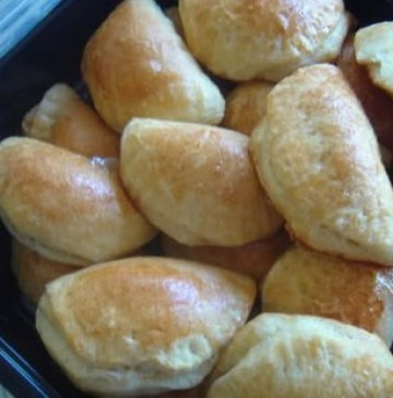 3。买罐装biscute (如下图 - 分层的那种), 每个分成三层,包入咖哩土豆牛肉末馅,刷上蛋液, 350f烤20分钟 (一罐可做24个)