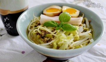 6.最后下入大白菜丝和绿豆芽,再次煮开后,淋在拉面上,摆上卤蛋、火腿,撒上葱绿,即可