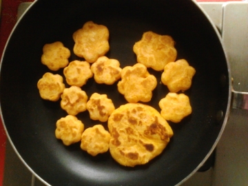 3.上锅煎了,一定要平底锅哦(因为甜的东西很容易焦的),放小许油,把饼放在里面,不想吃焦饼要积极翻哦,两面煎,大概3-5分钟就好了哦