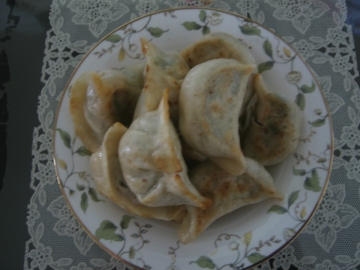 3.面在擀成皮以前要再揉至少一次,让面更筋道;擀皮包饺子;包得差不多的时候(大约可以包15个饺子),锅里放少许油,油7成热以后放入饺子,小火煎1分钟,底儿金黄以后,淋少许热水,盖上盖子焖一小会儿,到饺子皮变得透明以后,掀开盖子,把饺子的另外两面煎一下就好了。