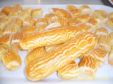 4)分分割成50克的面剂,滚圆,擀后包入肉松卷起.