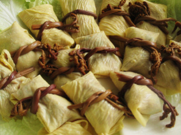 1.将豆腐皮放水中泡开,然后略微拧干一点(要小心,豆腐皮很薄的),不要担心太大一块,你不要摊开。你可以握成长条,然后根据长度随便等分几段。然后再一截一截摊开,一个一个包起来,和包春卷的方法一样,这里不赘述了。