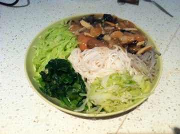 1.木耳,香菇用热水发开后切丝备用,豆芽去两头儿,洗净备用,黄瓜切丝装盘,白菜,青菜切丝备用,鸡蛋打散备用,