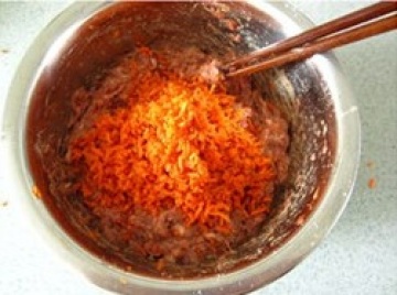 8倒入胡萝卜丁搅拌均匀。最后要包 时候放入圆葱丁