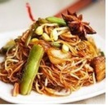 生鲜瘦肉肉丝——3两;,五花肉肉丝——3两;,芹菜梗——半斤。,豆芽——半斤;,新鲜的湿面条——1至1.5斤。,香菜——3,4根。,花椒,八角更各种调味料,适量