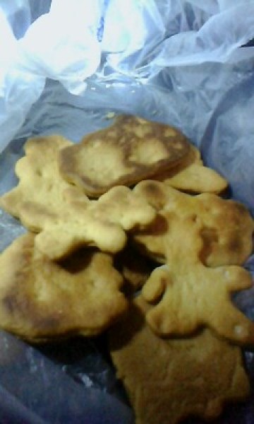 把所有的材料加在一起揉成面团,放个几分钟,糖要多放点,不然不甜。放好后把面团撖薄,越薄越好,再用模具压出形状出来,比较美观,最后放到电饭锅里烤,烤熟就好了。电饭锅里不能有水哦。