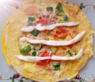 3、一次放上芝士片,金枪鱼碎肉、甜椒等配菜,均匀的浇上鸡蛋液,烘至半凝固然后翻面将蛋液彻底凝固即可