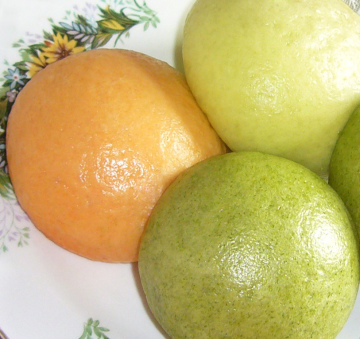 2、橙色馒头:用番茄酵种和面,加入了煮番茄酱时盛出的浮起的红油,比较艳丽;