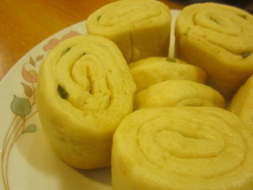 2:把发酵好的面团用擀面杖擀成长方体,在上面均匀的涂上一层薄薄的油,撒上盐和葱花,然后卷起来,切成段就做好了。