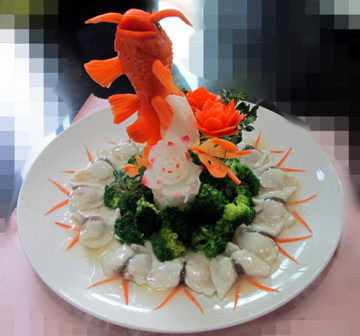 4、西兰花焯水和整雕一起摆入盘子中央。锅入清水下入鸡汁、食盐、味精勾玻璃芡淋香油、色拉油起锅浇于蝴蝶鱼饺上即可。