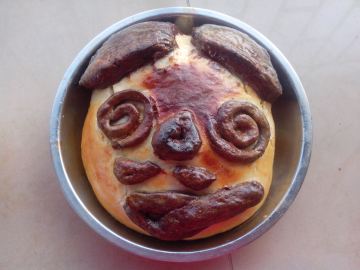 3、将椰蓉馅包入发好的没放可可粉的面团之中,弄成圆形放入烤盘,将发好的可可粉面团分别做成人物的眼睛、鼻子、胡子、嘴、雪茄和头发,粘在圆面团上,并刷上蛋液