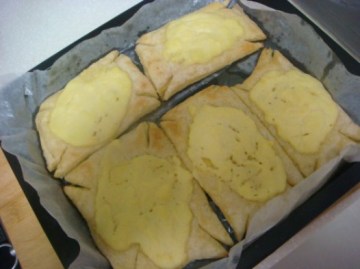7.放在铺有烘焙纸的烤盘上,挤上牛奶蛋糊,开始第二次发酵。180度的烤箱内烤焙10分钟。表层涂上爱吃的果酱