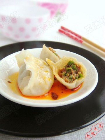1.馅料的做法:1.豇豆切碎盐稍码去水分。2.倒入搅好的肉馅。3.加鸡蛋,盐,味精,酱油,生粉,油少许搅上劲。4。用饺子皮包入适当的馅料。