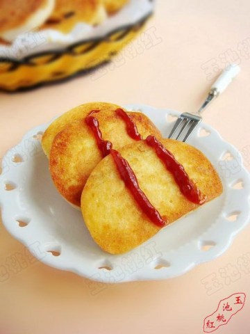 馒头三只,鸡蛋一只,适量的葱花、蕃茄沙司、炼乳。