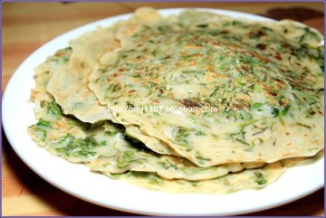3.不沾平底锅加上几滴油烧热盛上一大勺面糊放锅里快速晃动锅把使面糊形成一张跟锅底差不多大的饼,待面糊有点透明时翻动炒锅使饼整个翻过来再煎另一面略黄即可出锅