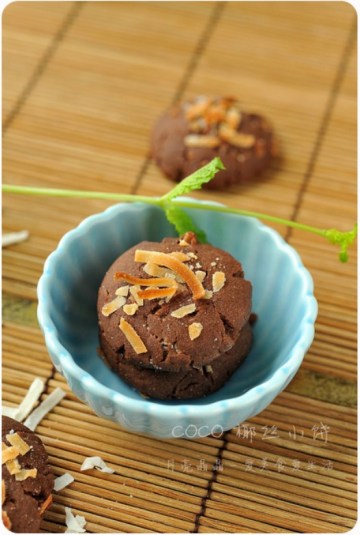 低筋面粉70g,可可粉10g,黄油38g,粗椰丝20g,糖粉30g,全蛋液15g