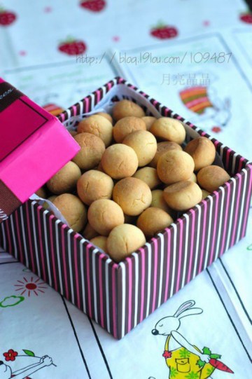 黄油80克,糖粉35克,蛋黄2个,低筋面粉90克,玉米淀粉40克,吉士粉5克,奶粉15克,泡打粉2克