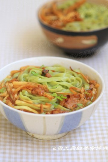 14.加上调料翻炒均匀即可。吃的时候,倒入菠菜面的上面