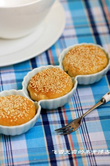 8 用手压成饼状,(沾满白芝麻后用手多揉揉炸的时候芝麻就不容易掉)。