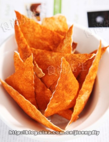 6.将涂上红辣椒粉的面皮用波浪滚刀切成三角形的薄片,以上下火170度烘烤10分钟