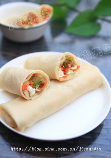 4.将2颗蛋打入一个长筒状的容器中打散后,加入面粉和糯米粉调匀,再慢慢加入适量水调成稀煳备用,然后淋在抹有少许油的锅中做成薄面皮,再起锅包入萝卜丝馅料后卷成卷状以面煳封口备用.