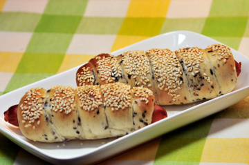 高筋麵粉460g,紅糖15g,鹽7g,水270g,乾酵母3.5g,黑芝麻45g。德式香腸8條,水1000g,白砂糖60g,白芝麻適量