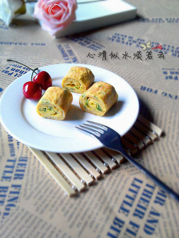 6、待蛋饼底部煎熟,表面刚刚熟的时候,卷起来,靠旁边放。