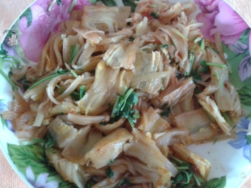我就准备了一些水,然后拿饭铲子往冷面上淋一淋,防止冷面变硬,淋几下就可以。下图这个冷面的十月的份量,刷了一层辣酱,但是很少。酱料自己随意调。