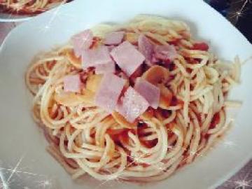 5.把意大利面盛在盘,然后倒入番茄蘑菇酱,把火腿丁撒在面上就大功告成啦!!