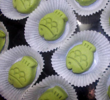 13、 第三个,外形看起来还不赖,可是这个粉粉粘上去,是不是没有晶莹剔透的感觉,和冰皮二字不沾边,看来模具上防粘不能用粉粉,还是改用油吧