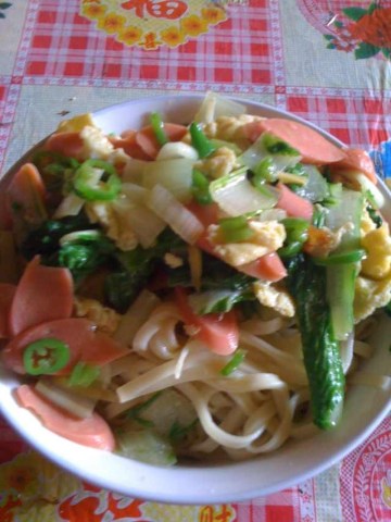 面条,小白菜,青椒,鸡蛋,火腿肠,葱,姜,油,盐