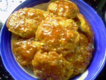 水125毫升,酵母1汤匙,黄油或猪油50克,细白砂糖100克,盐1茶匙,开水250毫升,炼乳250毫升,鸡蛋2个,打散,面粉950克,蔬菜油1升,油煎用,糖粉125克,洒在糕点上用