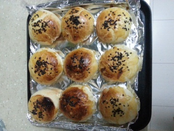 5、烤盘铺锡纸,面皮包入馅料,收口向下,放入烤盘,用手掌轻压成圆饼。饼皮上刷全蛋液,洒上黑芝麻。