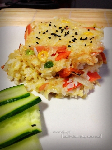 10.待炒好的米饭稍凉后,便可做成米饼,入加了油的平底锅小火煎
