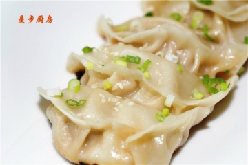 3.面在擀成皮以前要再揉至少一次,让面更筋道;擀皮包饺子;包得差不多的时候(大约可以包15个饺子),锅里放少许油,油7成热以后放入饺子,小火煎1分钟,底儿金黄以后,淋少许热水,盖上盖子焖一小会儿,到饺子皮变得透明以后,掀开盖子,把饺子的另外两面煎一下就好了。