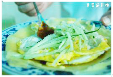 5、吃的时候自己动手将黄豆酱抹在面饼上,再放上一块煎蛋,撒些黄瓜丝,卷起来。黄豆酱卷在里面,吃起来就像山东大饼的味道。
