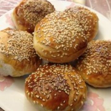5、制饼:把剂子擀皮包入馅,压扁擀成小饼状,刷蛋液沾芝麻,先在平锅上少许油小火烙一下,再入烤箱170度烤15分钟呈金黄色就好了。