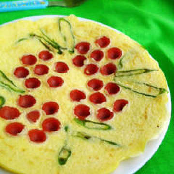 1. 准备食材。 2. 烤香肠切成0.3厘米左右的薄片;辣椒斜切薄片。 3. 鸡蛋打散,加入少许清水。 4. 适量面粉,加少许盐,搅拌均匀。面糊做成提起筷子,糊能很快很顺畅的流下来。 5. 平底刷一层薄油,放入切好的香肠片和辣椒片。 6. 煎至香肠一面鼓起,摆出花的造型。 7. 从外圈开始向里,划圈式,倒入面糊,慢慢倒。 8. 小火慢煎,翻面煎熟即可出锅!