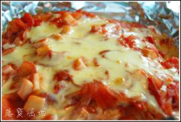 2.快火下油(约1汤匙)起锅,爆香蒜茸,加洋葱和1茶匙盐炒软;加香肠炒香及炒熟,加入蕃茄炒香,再加入汁料炒匀,汁开后淋于意大利面上,再洒上芝士,放入烤炉用约摄氏200度烤至芝士金黄,洒上香草即成。