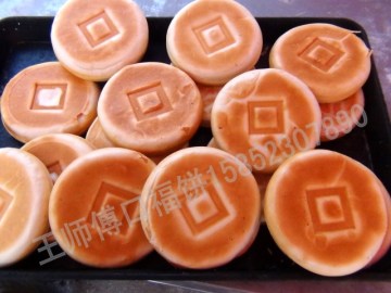 口福饼是采用模具进行制作,属于发面饼的一种,松软可口,麦香诱人,制作模具形状有口福形、黄金形、吉祥形、双喜形等。