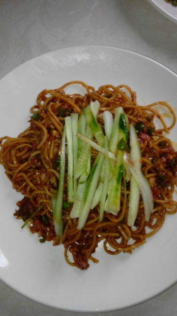 2、白斩鸡切丝,黄瓜洗净、切丝,均放在煮好的面条上;