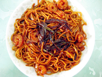 虾仁、面条、葱(最好是小葱)、蒜、耗油、生抽、老抽、海鲜酱油、糖