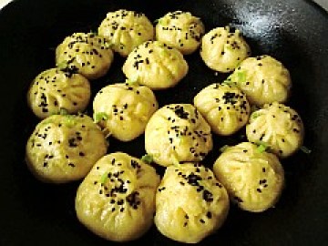 :皮酥,汁浓,肉香,精巧。 外皮底部焦脆,上半部撒上一些芝麻和葱花闻起来香香的,咬上一口肉香,油香,芝麻香,葱香混合在一起在口中久久留香。 成品色白软而松,肉馅鲜嫩。