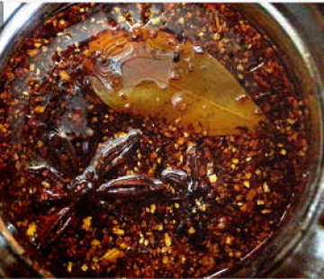 大蒜2瓣、干辣椒10克、花椒5克、豆蔻5克、肉桂5克、八角1粒、香叶1片、桂皮1块、菜油100克、白芝麻少许