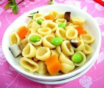 1、用30度的水加到放面的盆中把面和好后稍饧,擀成0.8厘米宽的面片,再切成丁,用筷子尖将小面丁压成酒窝状,下入沸水锅中煮熟捞出待用,西兰花氽水待用;