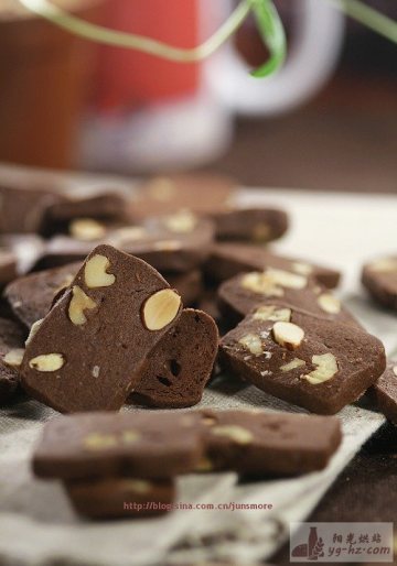 配料:低筋面粉130克,可可粉20克,黄油80克,糖粉60克,鸡蛋25克,切碎的核桃仁20克,美国大杏仁30克,杏仁香精1/8小勺(0.625ml)
