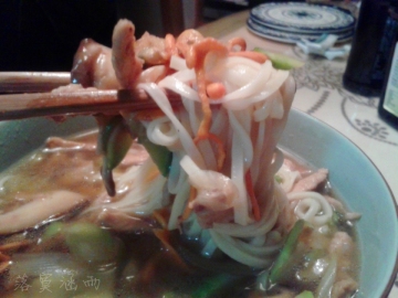 8、这个时候面条也好了,捞起加入早先准备好的虫草花汤,舀一大勺新鲜榨菜肉丝在面里。