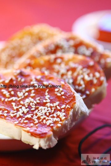 将白馒头切成约1cm厚的片,在烤盘上刷上厚厚的一层植物油,把馒头片排入烤盘,在馒头片上抹一层红腐乳,再洒上适量芝麻,放入预热好的烤箱烤焙即可。www.yg-hz.com/hongbeishipu/9896.