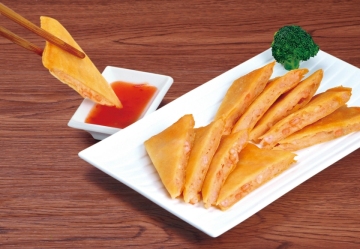 4.取一锅,倒入适量的油,以中火将油温烧至170℃,放入作法3的虾饼皮,以中火炸2分钟,至饼板呈金黄色捞出,将油沥干,切成三角状即成。食用时配沾泰式梅酱风味更佳。