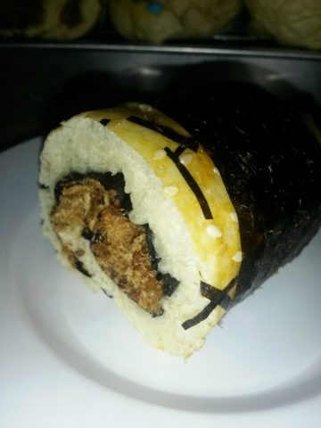 5、稍微凉后倒扣在保鲜膜上,用刀在面包上浅浅地割些刀口,抹上美乃滋、海苔片、肉松,连同保鲜膜把面包卷起,扭成糖果状。